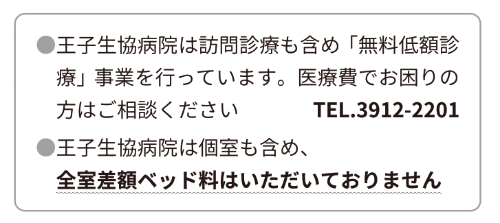 王子生協病院は訪問診療も 含め「無料低額診療」事業を 行っています